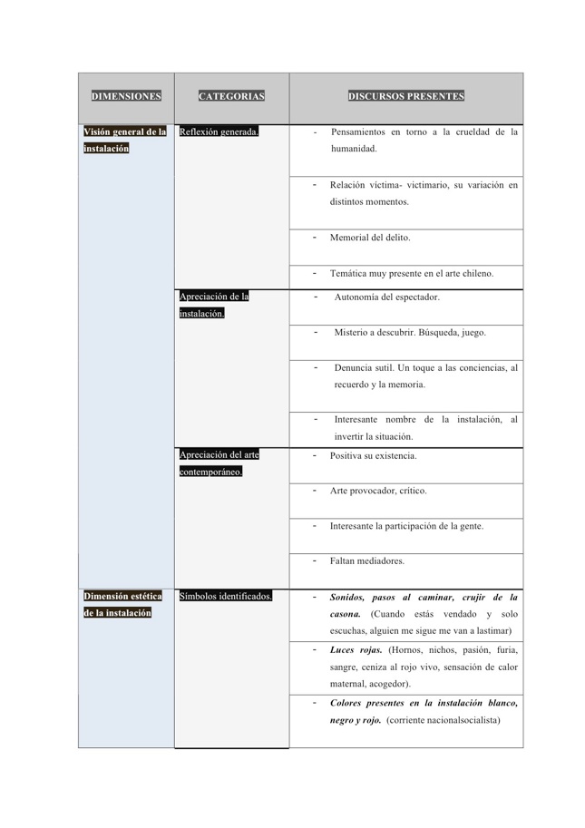 [2] Los objetivos específicos de esta investigación fueron: 1)Conocer los discursos construidos por los espectadores respecto a la instalación; 2) Indagar en los sentimientos y emociones que evoca la instalación en los sujetos.; 3) Averiguar el valor estético y de contenido que los sujetos identifican en la instalación.
