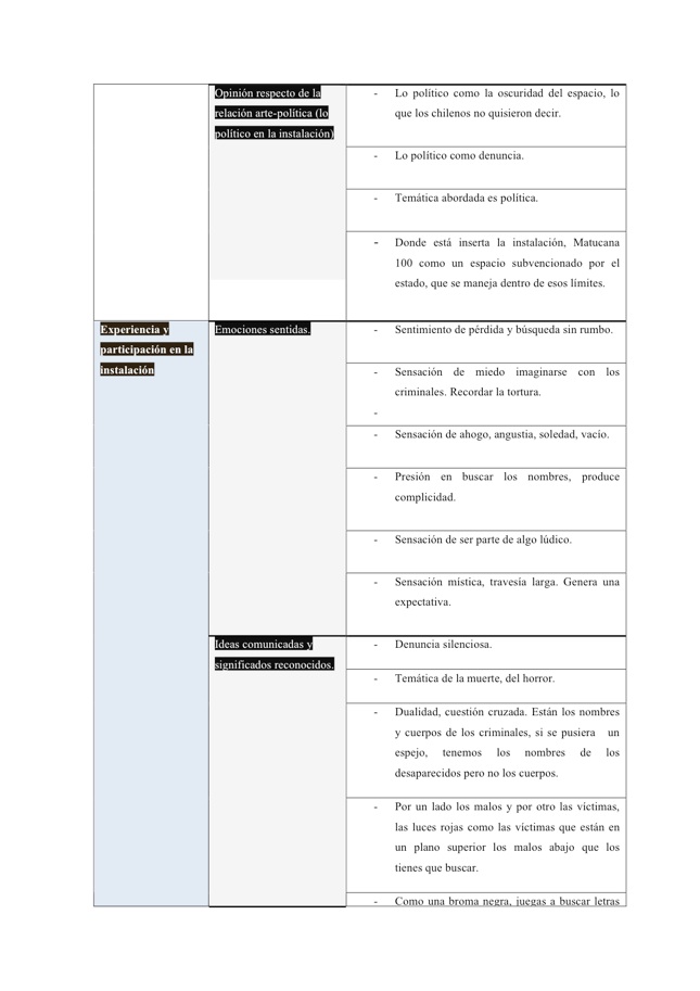 Asimismo, la participación que tiene el espectador al permitir un desplazamiento activo y creador, se observa como un elemento político. La posibilidad de buscar y encontrar a los criminales, se convierte en un desafío a la justicia chilena y en un acto simbólico de justicia. La autonomía del espectador tal vez sea uno de los puntos más valorados por los entrevistados. Rescatan la posibilidad de desplazarse libremente por la instalación y de focalizarse en aquello que les motiva. Aprecian el rol que juegan en esa interactividad con la obra, logran considerarse un elemento constitutivo de ella. Perciben una especie de demanda de búsqueda, sintiéndose parte de una gran exploración al pretender descubrir los nombres escritos en la sopa de letras. Asimismo, se valora la posibilidad de generar diálogo y potenciar los vínculos entre los ciudadanos. Quienes la visitaron, sintieron esa complicidad al re-vivir un tema doloroso para la sociedad chilena.