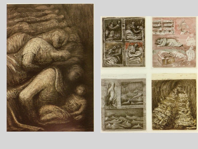 Henry Moore was commissioned for the War Arts project on the basis of his drawings of the scenes in the London tube, its subway system, where thousands of Londoners sought shelter during the Blitz, the bombing of London by German fighter planes. Fascinated by that “huge city in the bowels of the earth,” he spent a year producing hundreds of drawings that became highly influential for British artists such as Bacon for example. [11]